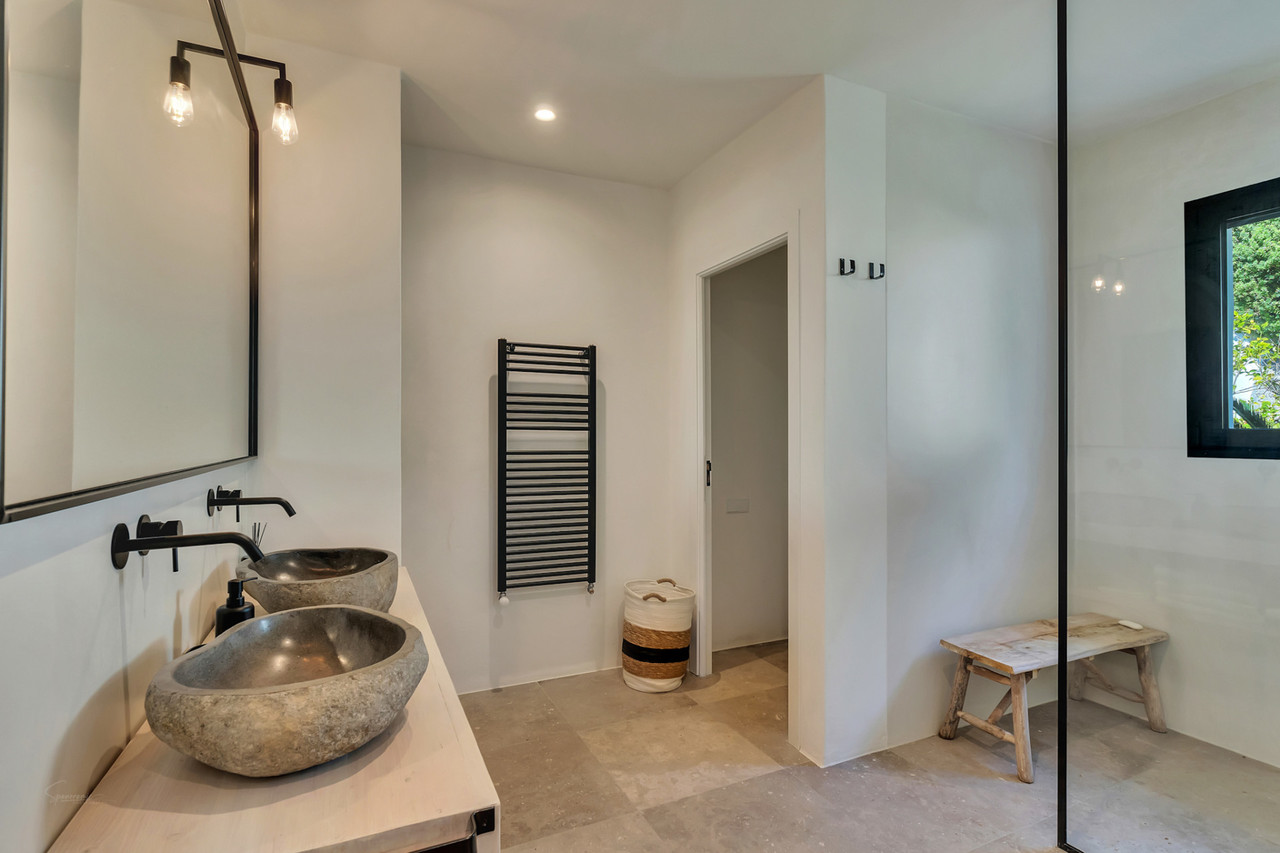 The 800 m² plot surrounding the villa is designed for optimal outdoor living. A pool is surrounded by a stylish sun terrace, a chill-out zone, and a barbecue area, all framed by lush Mediterranean gardens, creating a serene and exclusive atmosphere.