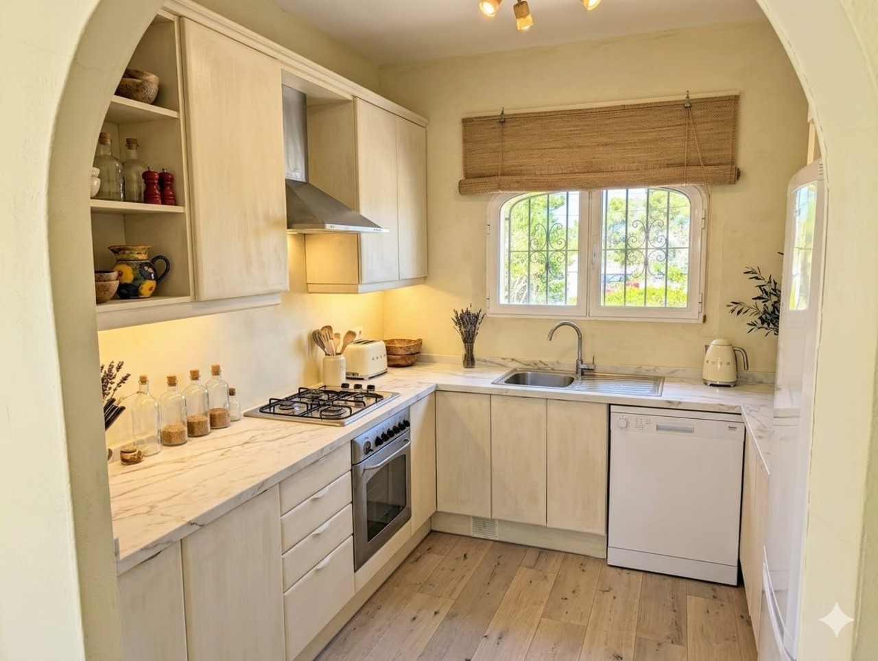 Minimalist Exteriors: Transform the traditional façade with smooth white plaster and light wood accents.Seamless Transitions: Replace dated tiles with light-plank flooring and natural marble worktops for an airy, organic feel.Natural Textures: Replace heavy stonework with hand-troweled plaster to create a serene, spa-like atmosphere indoors.