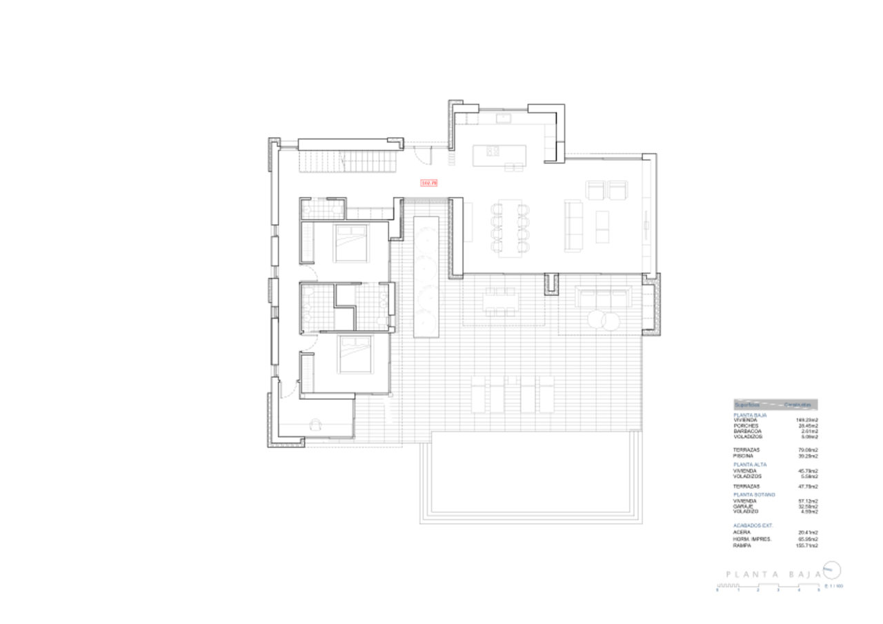 On the ground floor, there is a spacious hall, two bedrooms with en-suite bathrooms, a guest toilet and an open-plan living-dining room with a fully equipped kitchen (Bosch or equivalent) with a cooking island. From the living room, there is direct access to the covered terrace that leads to a sun terrace with a 5x8 metre infinity pool.
