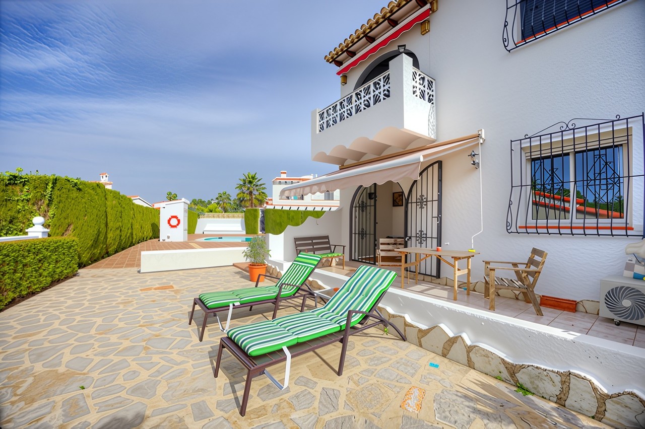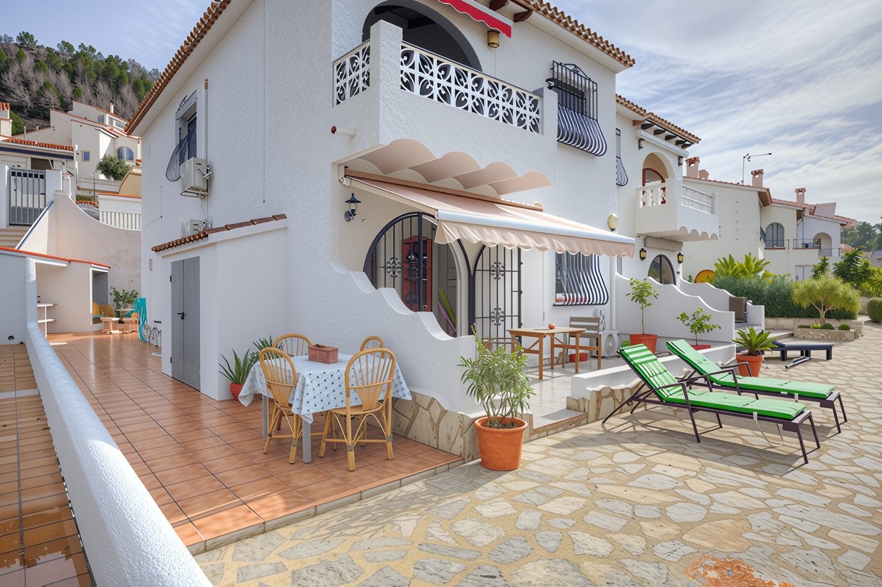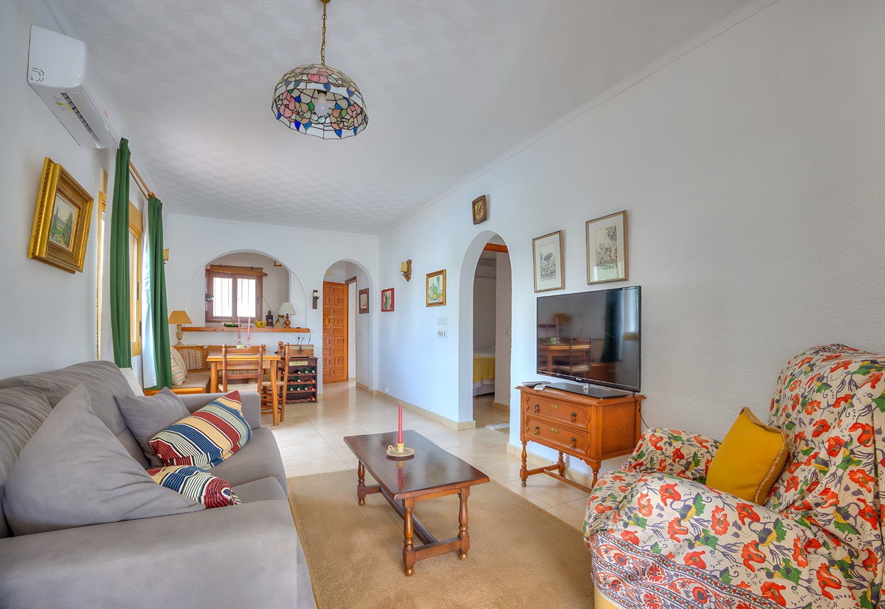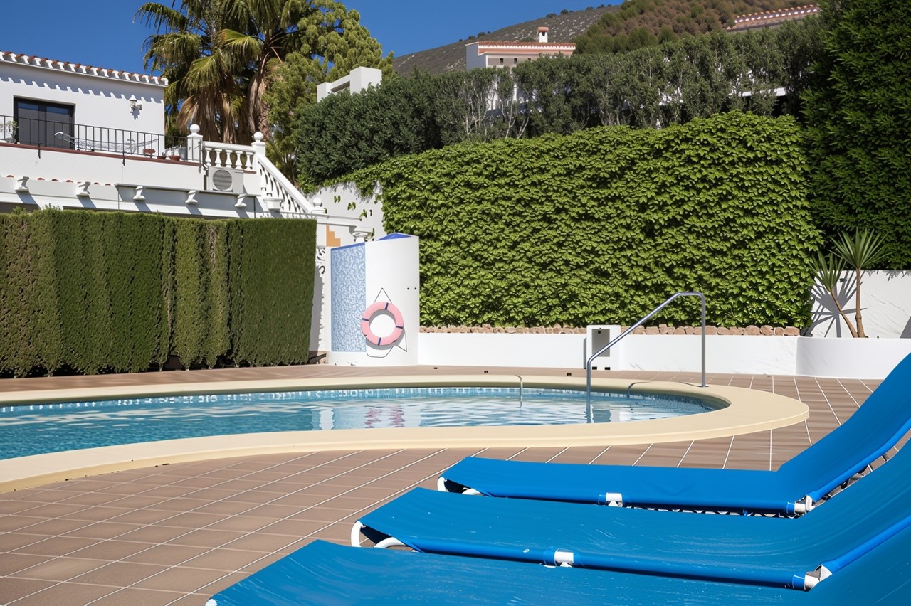 Exclusive Moraira Living: Spacious Apartment with 'Almost Private' Communal Pool Access!Imagine stepping out of your own private, terraced garden straight onto a sun-drenched terrace, surrounding an impressive 13 x 7 metre communal swimming pool – so peaceful and well-positioned it feels almost exclusive. This beautifully presented, two-bedroom apartment offers an unbeatable lifestyle in a superb Moraira location.Key Highlights for Your Moraira Retreat: Exceptional Location: Situated directly adjacent to a quiet, ample communal pool area, providing instant, easy access to swimming and sunbathing. Ultimate Convenience: You are just a few minutes' walk from shopping facilities, a fantastic selection of cafés, and Moraira's vibrant dining scene. Beautifully Designed Living Space: Generous, well-proportioned rooms throughout. An inviting open-plan living and dining room featuring a cozy fireplace. A bright, glazed porch leading directly out to your private exterior terraced gardens, perfect for alfresco dining. A fully equipped kitchen with an adjoining utility room and storage space. Comfort and Features: Two good-sized bedrooms complete with fitted wardrobes. A modern bathroom with a shower. Year-round comfort with hot and cold air conditioning in all rooms. Quality features including aluminium exterior carpentry with double glass and a retractable sun awning on the terrace. Practicality: The apartment also benefits from a handy external, lockable storage cupboard and a desirable south-westerly exposure offering lovely open views and plenty of sun. This apartment is the ideal choice for those seeking a tranquil, well-appointed holiday home or a permanent residence, combining superb accessibility with the coveted feature of an almost-private, generous communal pool.