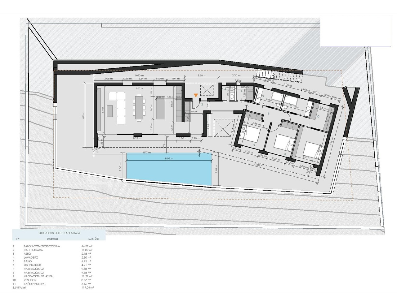 The expansive terrace with a 32 m² pool is the perfect place to unwind and enjoy nature.