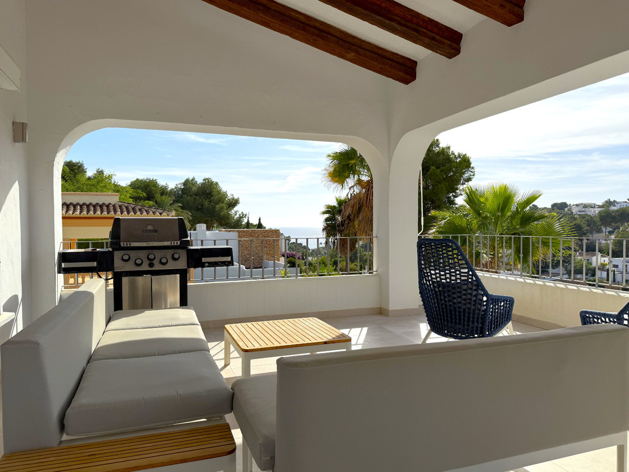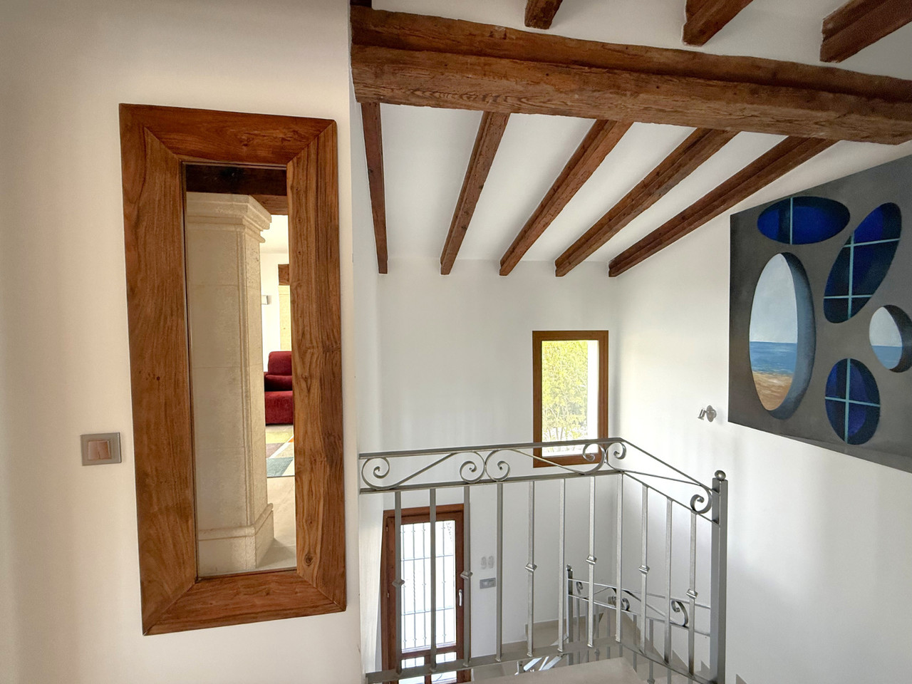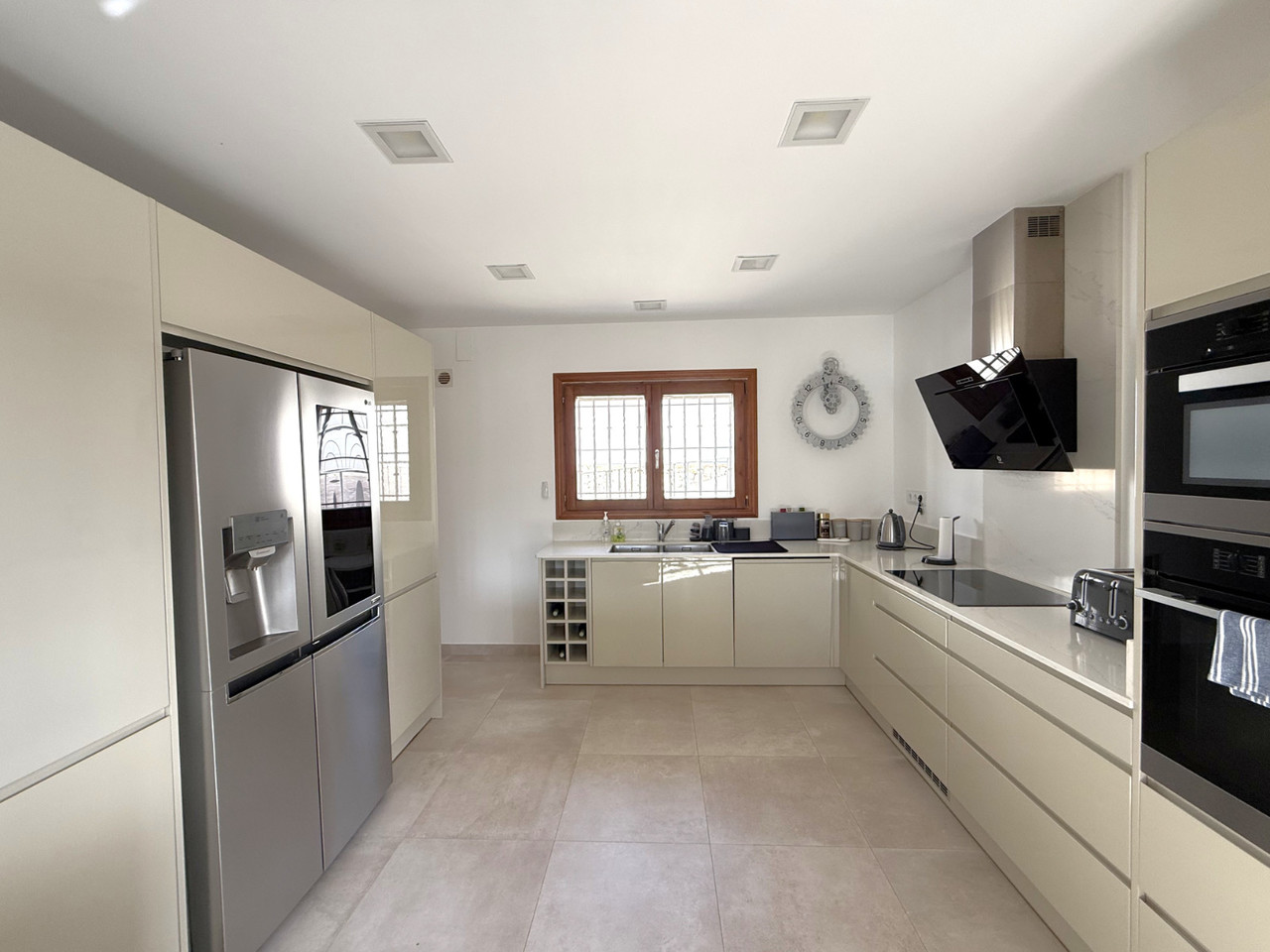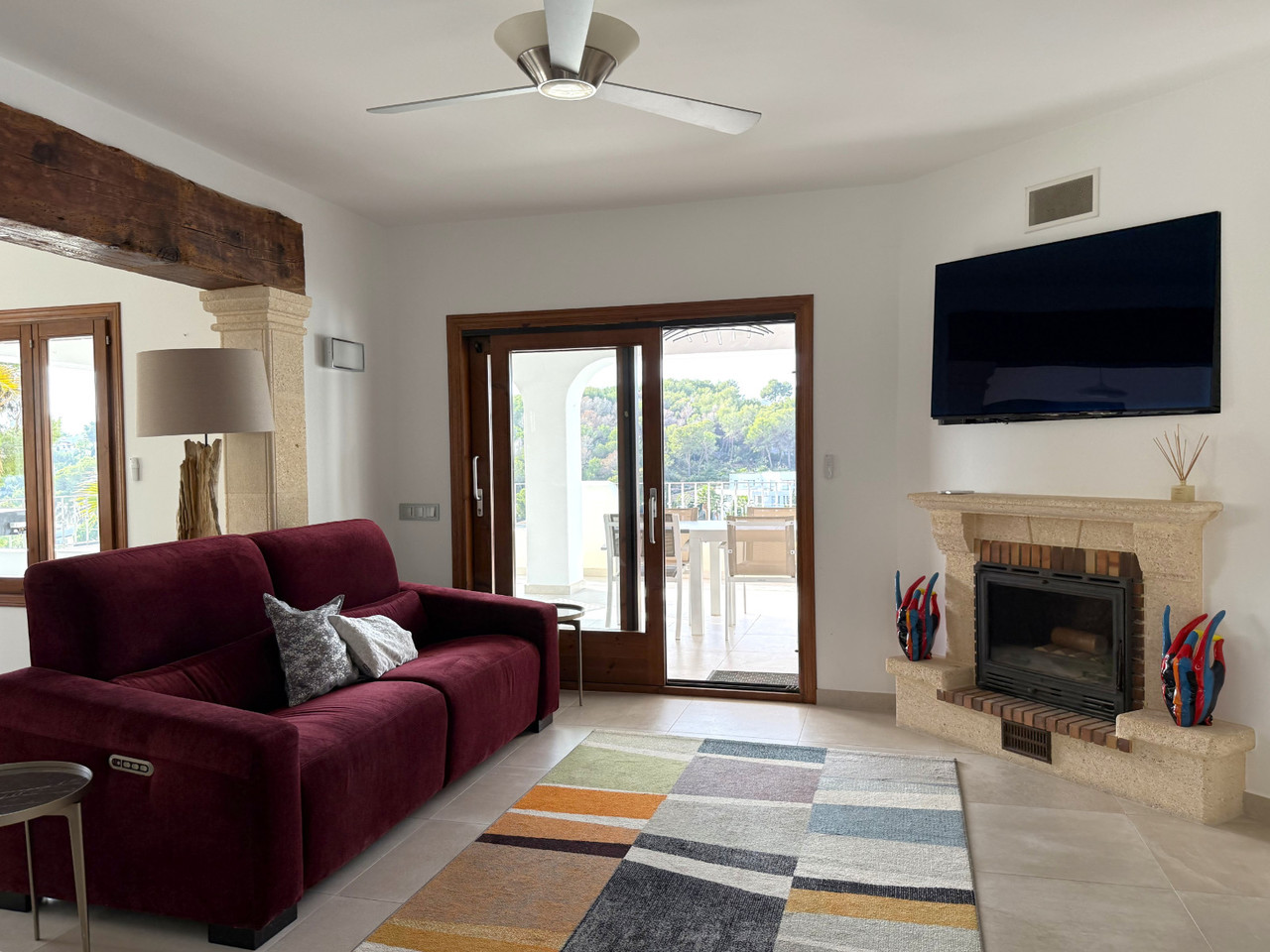 A magnificent, south facing, year 2010, luxury villa built in a style incorporating an imaginative pastiche of design facets from the whole of the Mediterranean region. Amongst the many traditional features are aged oak beams throughout the property, fabulous Tosca sandstone columns and plantation style shutters on the poolside bedroom windows and carefully chosen ceramics to complement the traditional feel. This superior property boasts spectacular views over the surrounding countryside with the Mediterranean Sea in the near distance and is enviably located within walking proximity of the tapas bars and restaurants of El Portet and the shallow waters of its fabulous sandy beach. Electric gate takes you to the ample driveway with two covered parking spaces. Superbly renovated throughout. The main floor has a large living area with a centred log burner and dining area with an open plan kitchen and adjacent pantry. The modern kitchen is perfectly equipped with Miele appliances. Patio doors from the lounge to a spacious covered terrace from which you can enjoy the wonderful open views over the valley and the sea. Also on this floor is the master bedroom ensuite and another double bedroom. Also a guest cloakroom. A stylish interior staircase takes you down to three double bedrooms of which one is a master ensuite with walk in wardrobes. Also another bathroom for the two rooms to share. All three bedrooms have access to the pool terrace with its 8 x 4 heated pool. A fantastic utility room and a huge store room. Also access to the outside area from a side door before coming down to the bedrooms. The pool is heated through an air recovery system and so is the hot water. Electric blinds throughout and two separate split systems. And the best of it all…walking distance to the fabulous El Portet beach! Prime villa in a prime location.