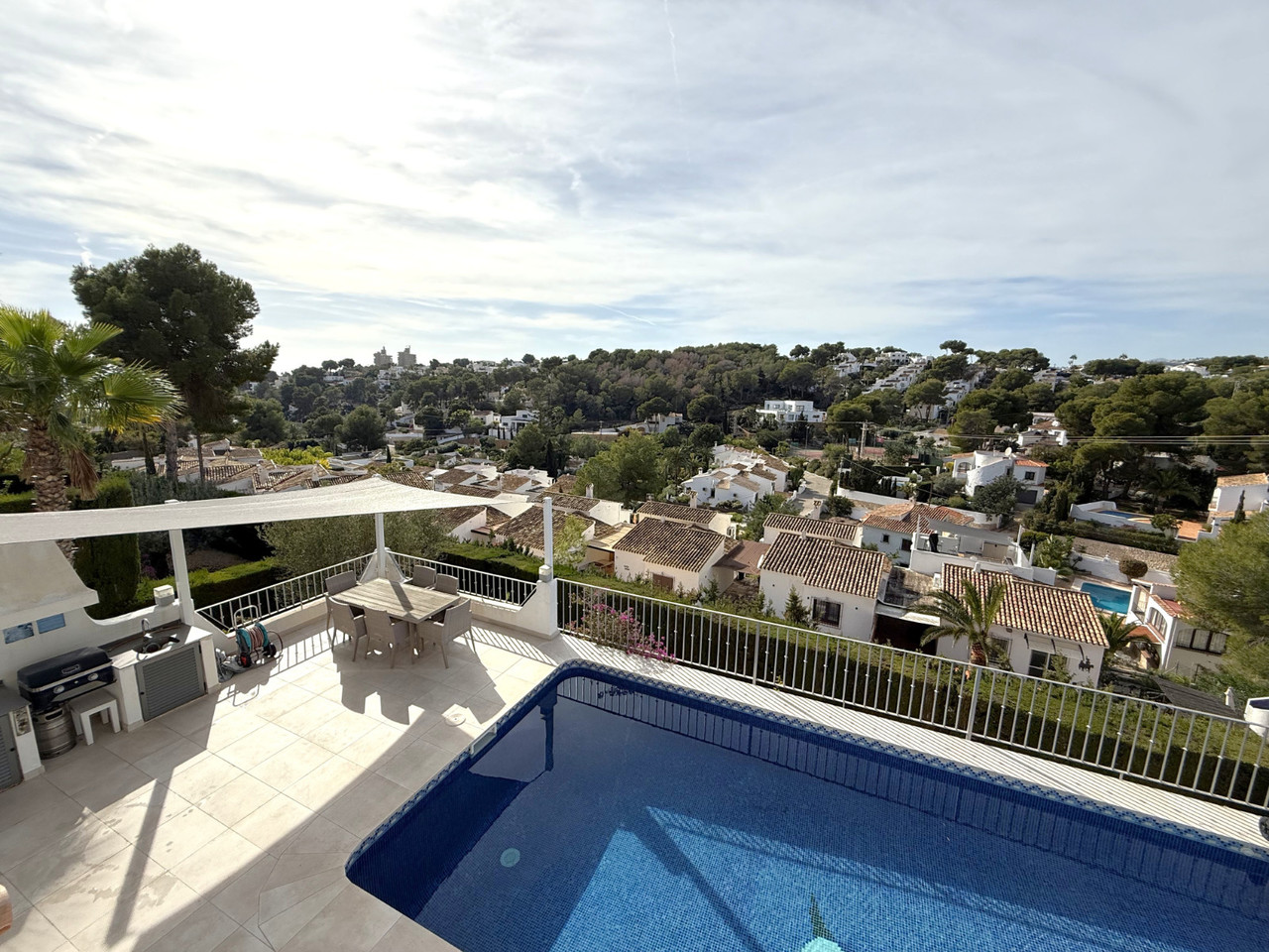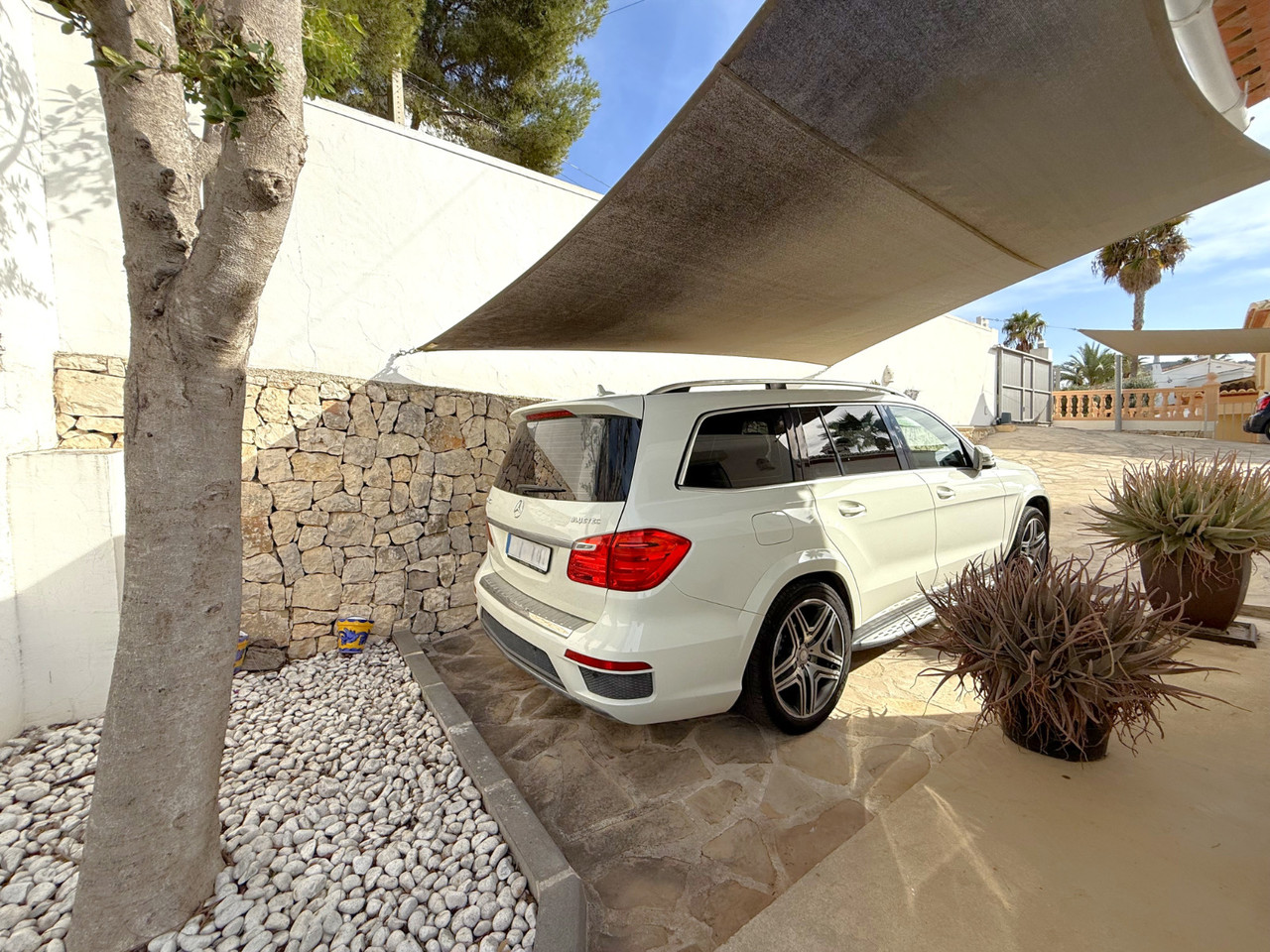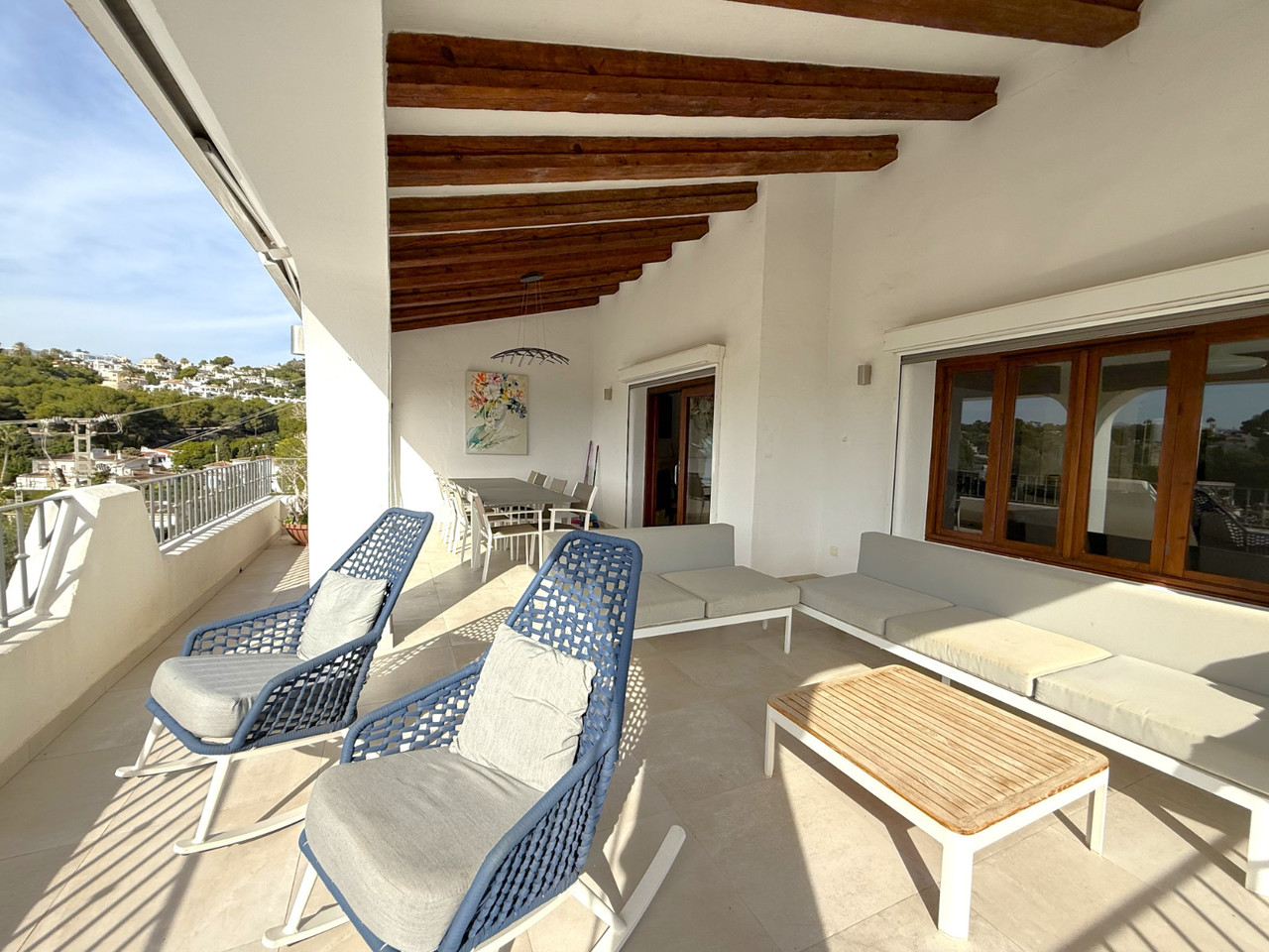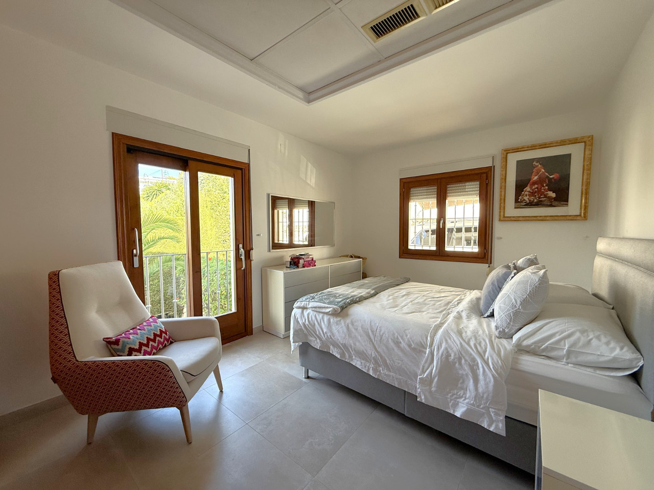 A magnificent, south facing, year 2010, luxury villa built in a style incorporating an imaginative pastiche of design facets from the whole of the Mediterranean region. Amongst the many traditional features are aged oak beams throughout the property, fabulous Tosca sandstone columns and plantation style shutters on the poolside bedroom windows and carefully chosen ceramics to complement the traditional feel. This superior property boasts spectacular views over the surrounding countryside with the Mediterranean Sea in the near distance and is enviably located within walking proximity of the tapas bars and restaurants of El Portet and the shallow waters of its fabulous sandy beach. Electric gate takes you to the ample driveway with two covered parking spaces. Superbly renovated throughout. The main floor has a large living area with a centred log burner and dining area with an open plan kitchen and adjacent pantry. The modern kitchen is perfectly equipped with Miele appliances. Patio doors from the lounge to a spacious covered terrace from which you can enjoy the wonderful open views over the valley and the sea. Also on this floor is the master bedroom ensuite and another double bedroom. Also a guest cloakroom. A stylish interior staircase takes you down to three double bedrooms of which one is a master ensuite with walk in wardrobes. Also another bathroom for the two rooms to share. All three bedrooms have access to the pool terrace with its 8 x 4 heated pool. A fantastic utility room and a huge store room. Also access to the outside area from a side door before coming down to the bedrooms. The pool is heated through an air recovery system and so is the hot water. Electric blinds throughout and two separate split systems. And the best of it all…walking distance to the fabulous El Portet beach! Prime villa in a prime location.