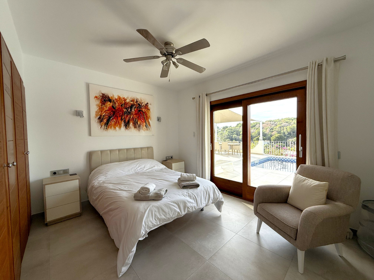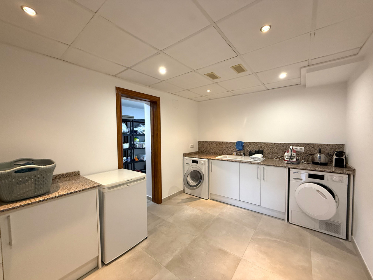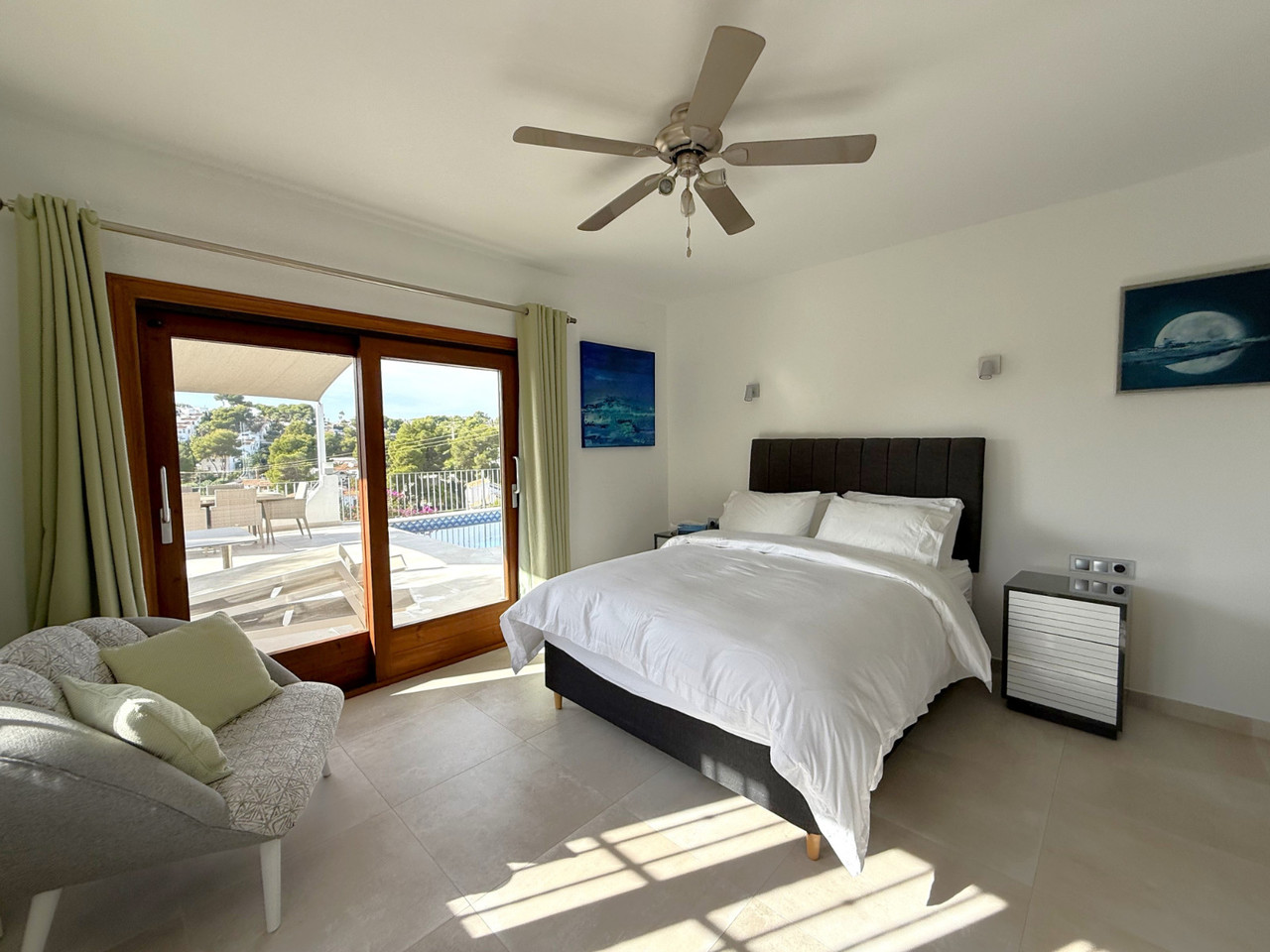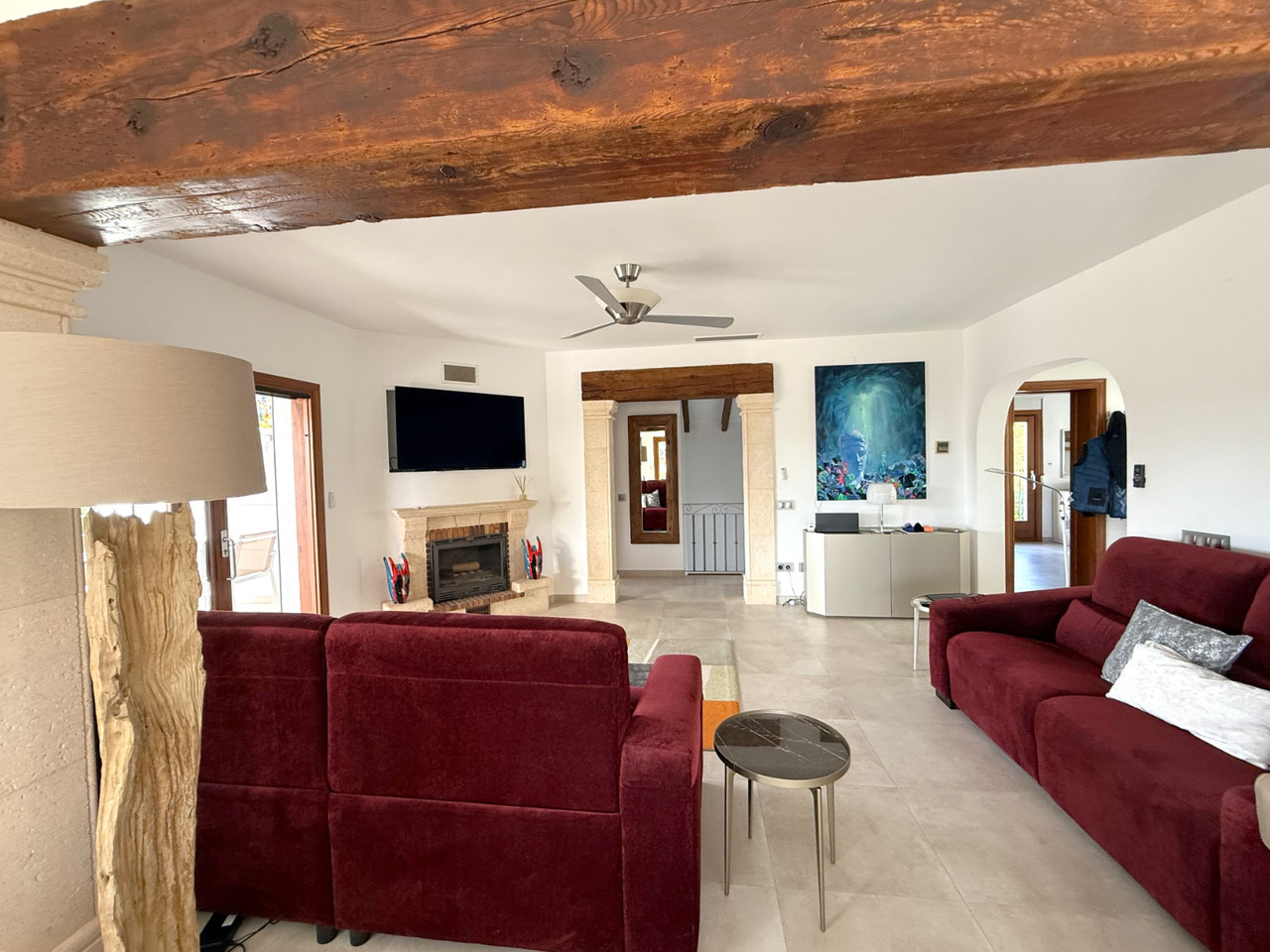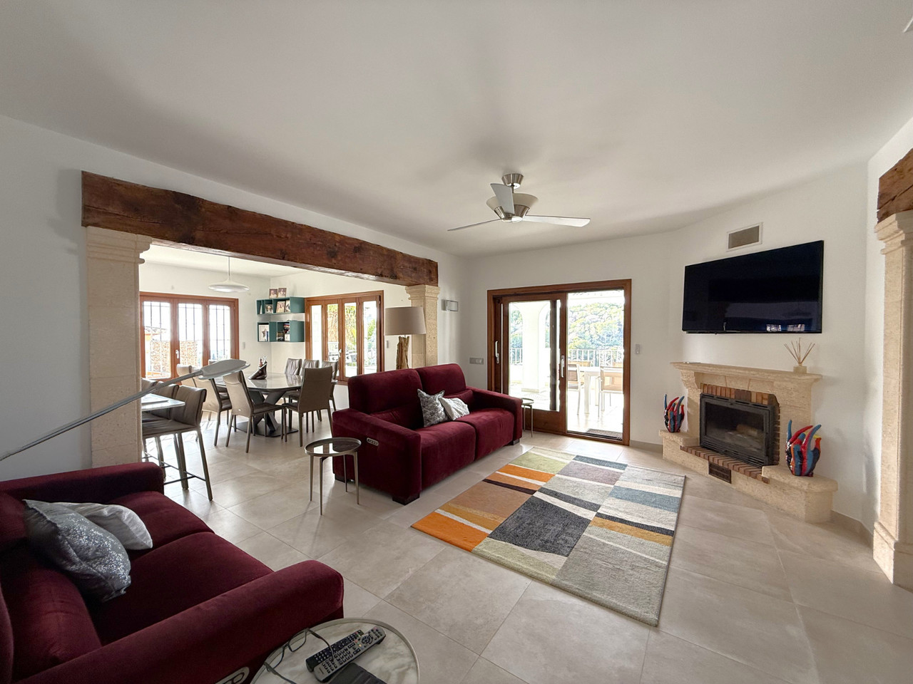 A magnificent, south facing, year 2010, luxury villa built in a style incorporating an imaginative pastiche of design facets from the whole of the Mediterranean region. Amongst the many traditional features are aged oak beams throughout the property, fabulous Tosca sandstone columns and plantation style shutters on the poolside bedroom windows and carefully chosen ceramics to complement the traditional feel. This superior property boasts spectacular views over the surrounding countryside with the Mediterranean Sea in the near distance and is enviably located within walking proximity of the tapas bars and restaurants of El Portet and the shallow waters of its fabulous sandy beach. Electric gate takes you to the ample driveway with two covered parking spaces. Superbly renovated throughout. The main floor has a large living area with a centred log burner and dining area with an open plan kitchen and adjacent pantry. The modern kitchen is perfectly equipped with Miele appliances. Patio doors from the lounge to a spacious covered terrace from which you can enjoy the wonderful open views over the valley and the sea. Also on this floor is the master bedroom ensuite and another double bedroom. Also a guest cloakroom. A stylish interior staircase takes you down to three double bedrooms of which one is a master ensuite with walk in wardrobes. Also another bathroom for the two rooms to share. All three bedrooms have access to the pool terrace with its 8 x 4 heated pool. A fantastic utility room and a huge store room. Also access to the outside area from a side door before coming down to the bedrooms. The pool is heated through an air recovery system and so is the hot water. Electric blinds throughout and two separate split systems. And the best of it all…walking distance to the fabulous El Portet beach! Prime villa in a prime location.