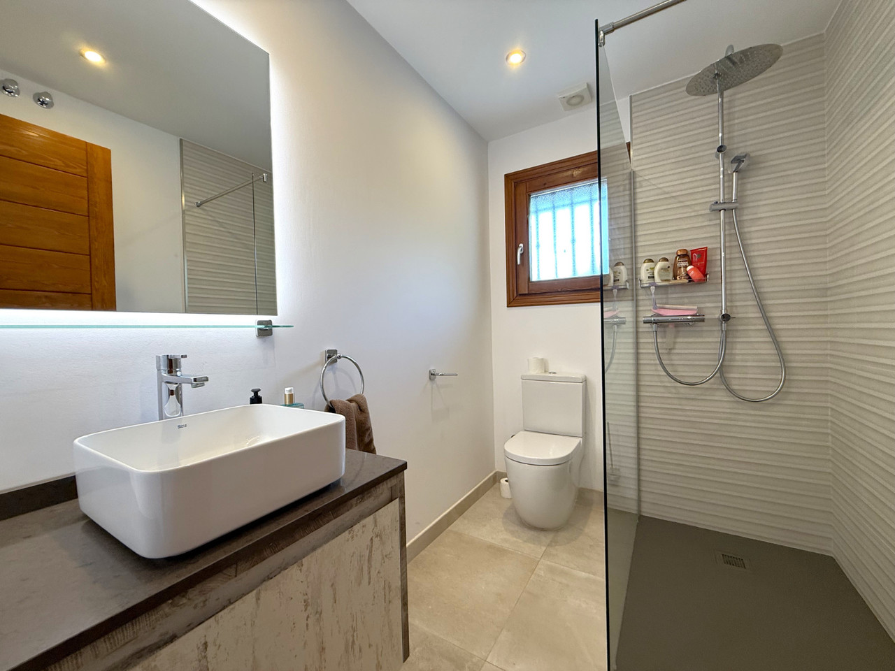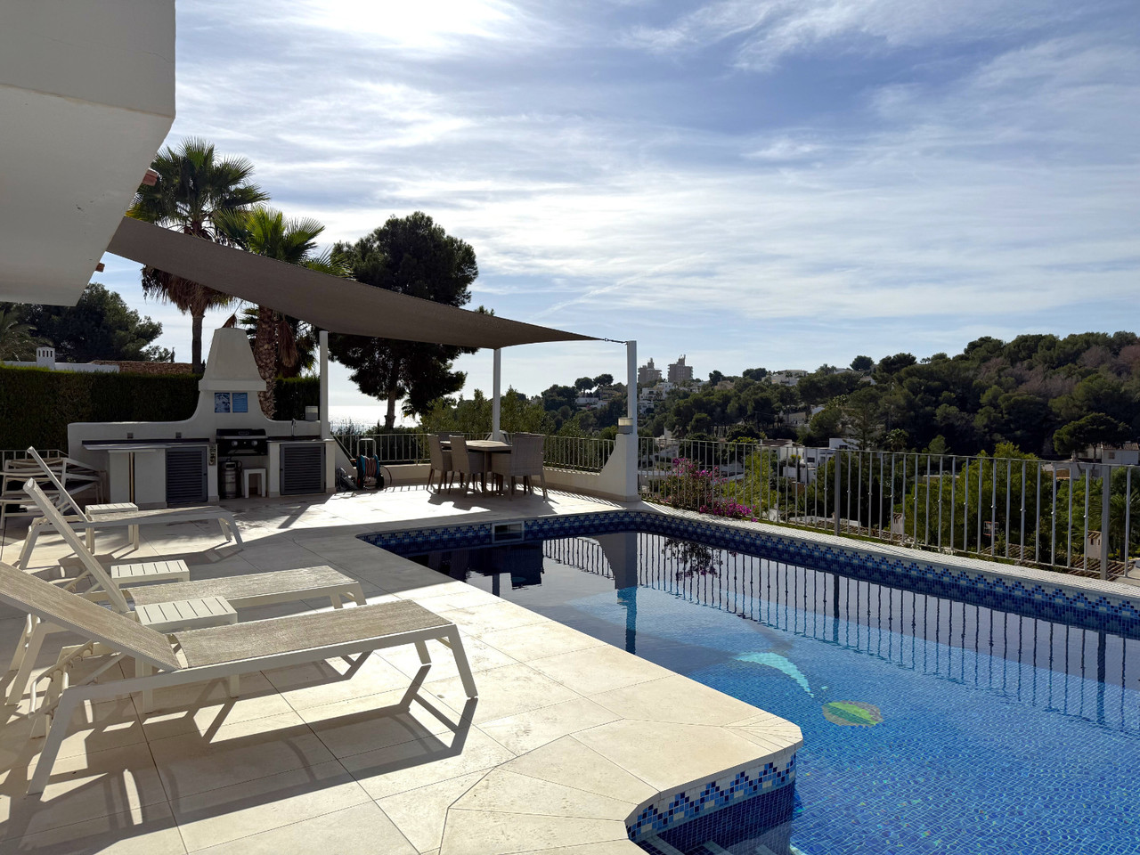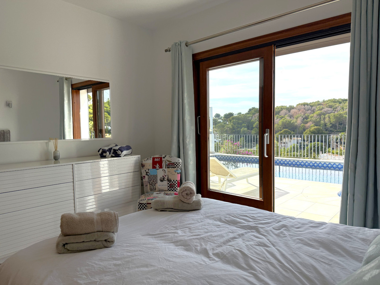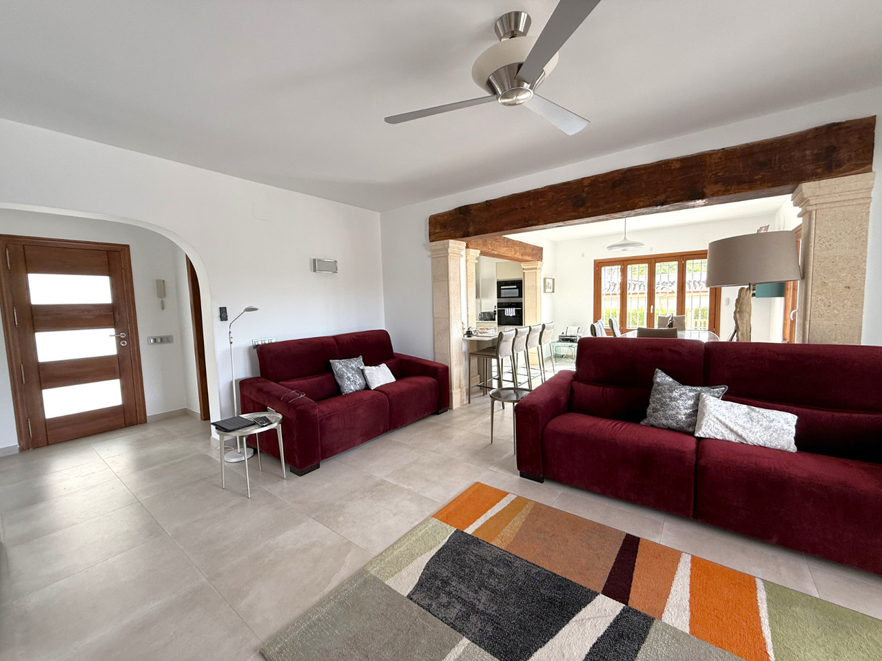 A magnificent, south facing, year 2010, luxury villa built in a style incorporating an imaginative pastiche of design facets from the whole of the Mediterranean region. Amongst the many traditional features are aged oak beams throughout the property, fabulous Tosca sandstone columns and plantation style shutters on the poolside bedroom windows and carefully chosen ceramics to complement the traditional feel. This superior property boasts spectacular views over the surrounding countryside with the Mediterranean Sea in the near distance and is enviably located within walking proximity of the tapas bars and restaurants of El Portet and the shallow waters of its fabulous sandy beach. Electric gate takes you to the ample driveway with two covered parking spaces. Superbly renovated throughout. The main floor has a large living area with a centred log burner and dining area with an open plan kitchen and adjacent pantry. The modern kitchen is perfectly equipped with Miele appliances. Patio doors from the lounge to a spacious covered terrace from which you can enjoy the wonderful open views over the valley and the sea. Also on this floor is the master bedroom ensuite and another double bedroom. Also a guest cloakroom. A stylish interior staircase takes you down to three double bedrooms of which one is a master ensuite with walk in wardrobes. Also another bathroom for the two rooms to share. All three bedrooms have access to the pool terrace with its 8 x 4 heated pool. A fantastic utility room and a huge store room. Also access to the outside area from a side door before coming down to the bedrooms. The pool is heated through an air recovery system and so is the hot water. Electric blinds throughout and two separate split systems. And the best of it all…walking distance to the fabulous El Portet beach! Prime villa in a prime location.