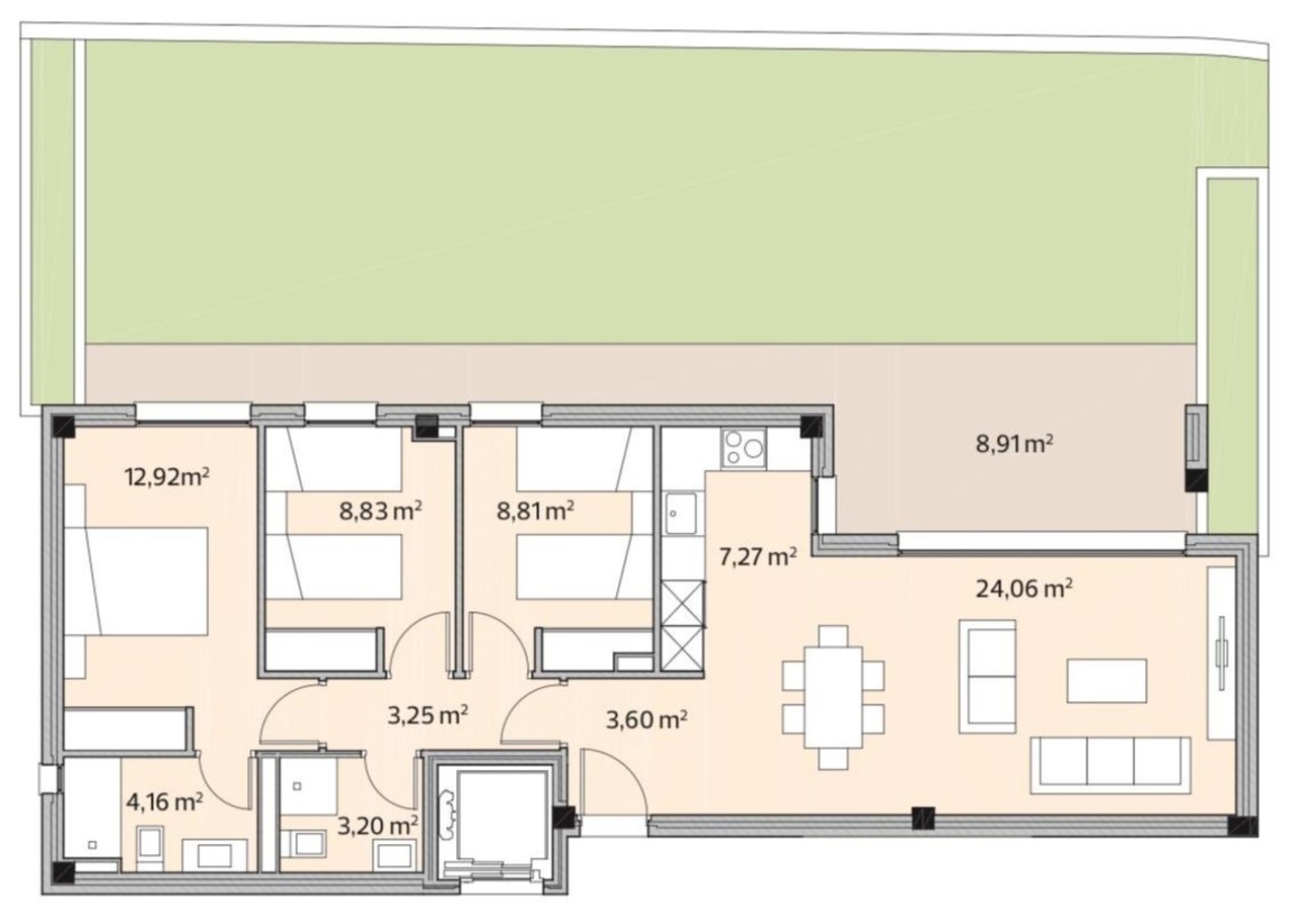 The apartment features a spacious entrance hall and a bright living–dining area with direct access to a fantastic terrace and an impressive 100m² private garden, ideal for enjoying outdoor living all year round. The garden also offers direct access to the communal green areas and the swimming pool. The fully equipped American-style kitchen, with its sleek modern design, integrates seamlessly into the living space. The master bedroom includes an en-suite bathroom and access to the garden, complemented by two additional bedrooms with built-in wardrobes and a second full bathroom.