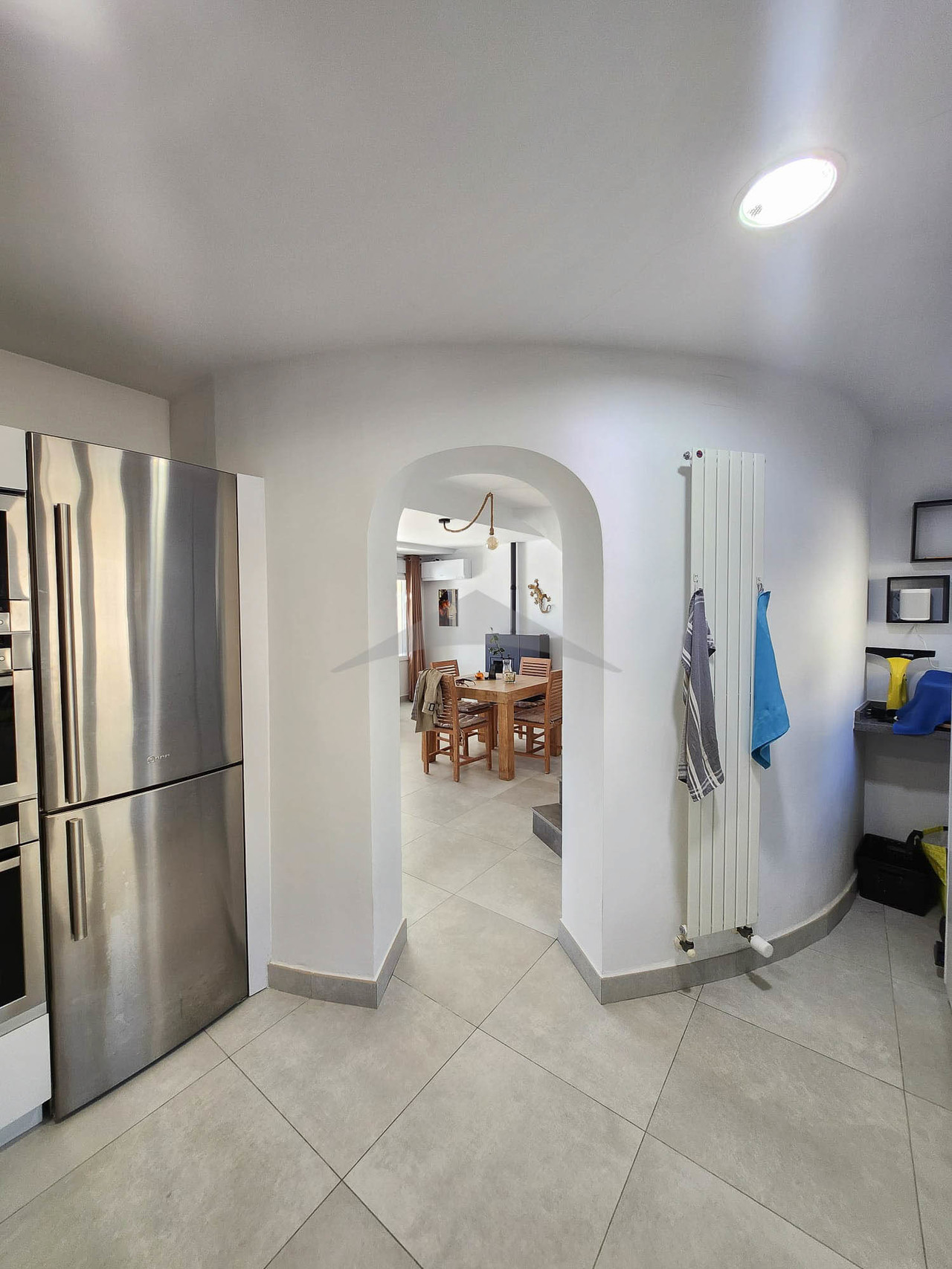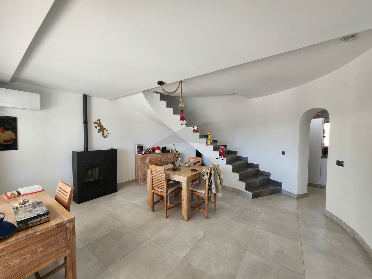 On the ground floor, there are two bedrooms and one bathroom. The property features two bright living rooms, one of which includes a pellet fireplace, enhancing the comfort and warm atmosphere of the home. The dining area, located next to a fully equipped independent kitchen, creates functional and welcoming living spaces.