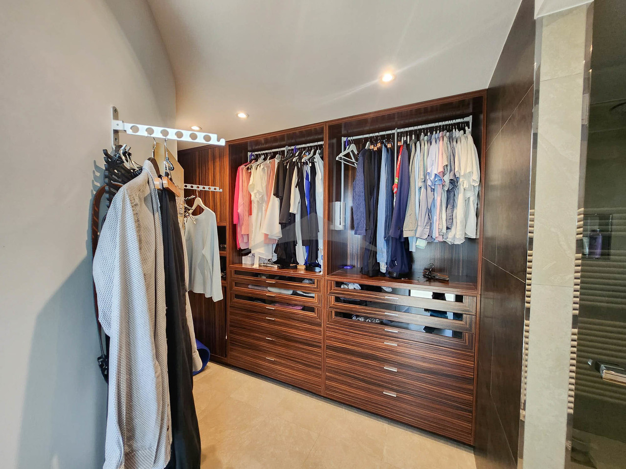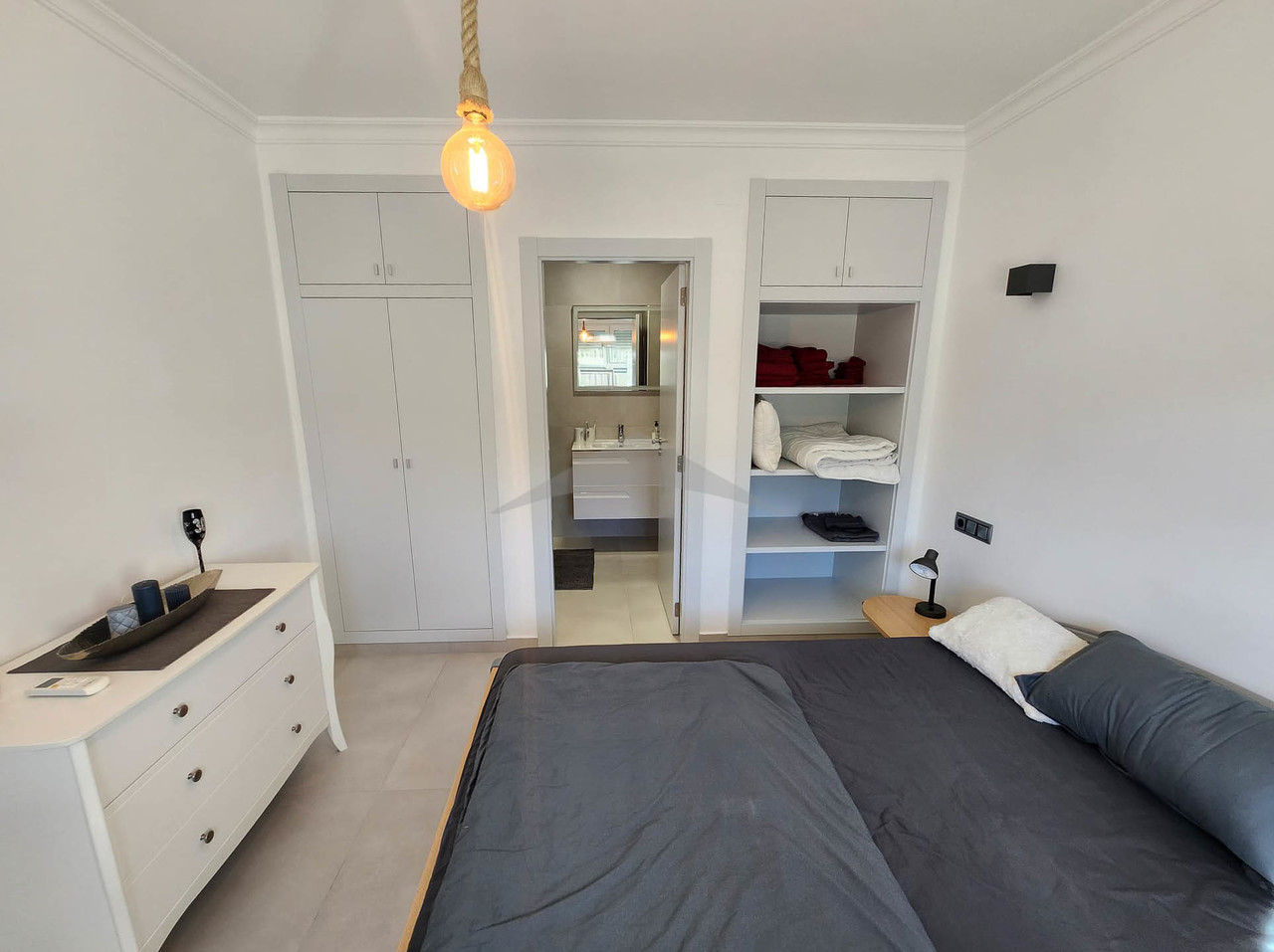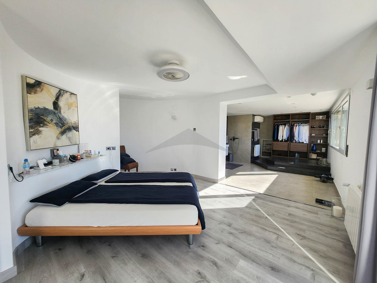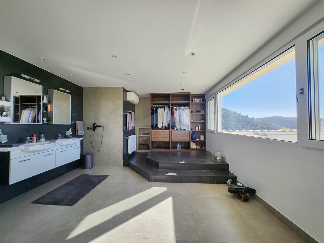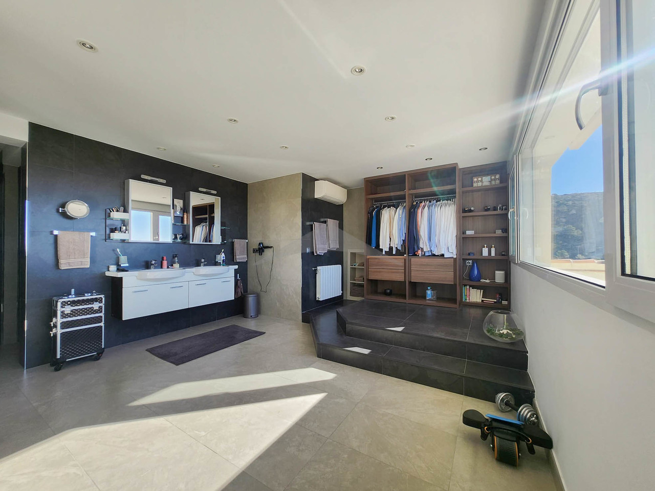 Upstairs, the master suite offers an outstanding private retreat with a large dressing room, a complete bathroom, underfloor heating, split air conditioning, and a private terrace with sea views.