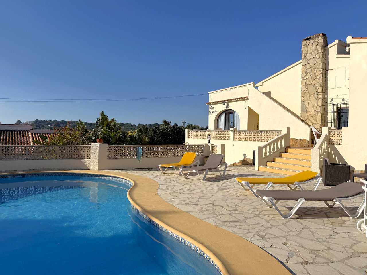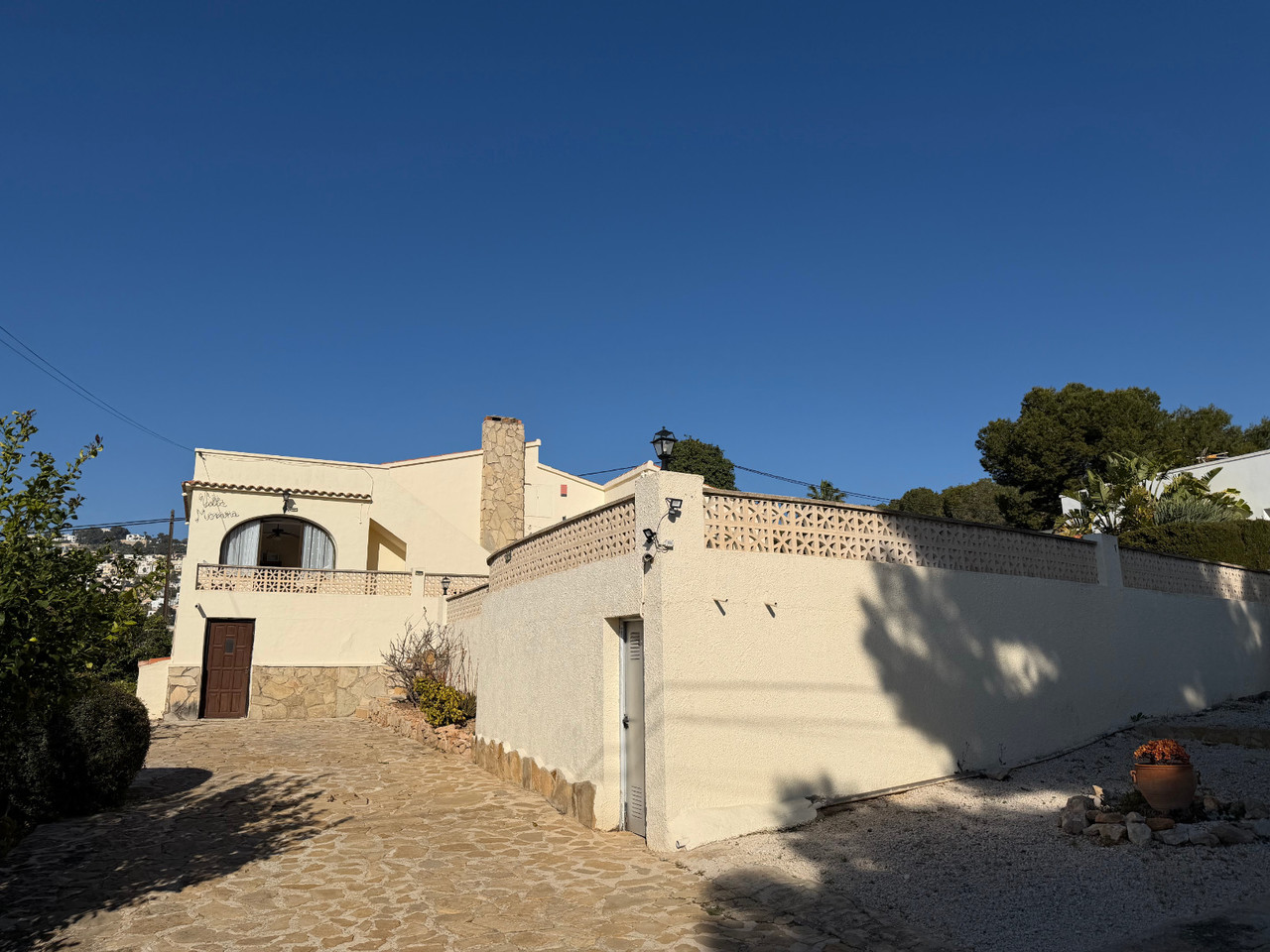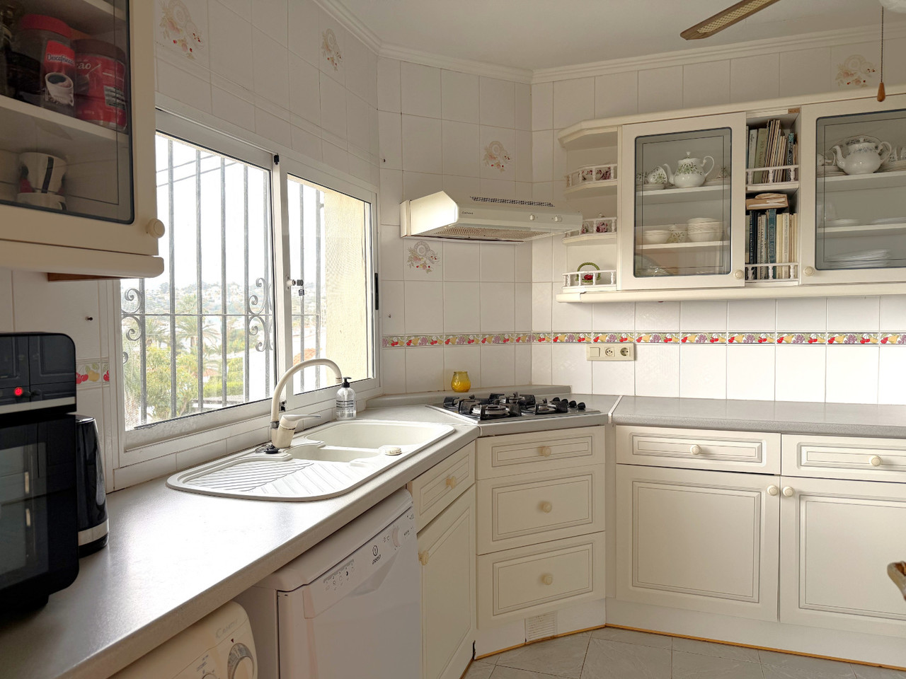 Located in a quiet residential area within easy walking distance of Moraira, this well-maintained villa offers generous accommodation, excellent outdoor space, and great accessibility. Set on a completely flat plot, the property provides easy access and excellent usability, making it ideal for families, retirees, or as a holiday retreat. A gated entrance opens onto a private driveway with ample parking for several vehicles. On this level, there is also a substantial under build currently used for storage, offering excellent potential to be converted into a garage or additional accommodation if desired. A few steps lead up to an inviting terrace overlooking the 9 x 5 kidney shaped pool, surrounded by multiple terraced seating areas—perfect for relaxing, sunbathing, or entertaining guests. The villa is set on a flat plot and enjoys a lovely Mediterranean garden featuring lemon, lime, orange, and nispero trees, adding both charm and practicality. The entrance opens into a bright dining area, elegantly separated from the generous lounge by attractive archways. The large lounge features a centrally positioned gas fireplace, creating a warm and welcoming focal point. From the dining room, there is access to a fully enclosed kitchen, which also provides direct access to the rear of the property. Here you will find a specially designed wheelchair access, ensuring practicality and ease of movement. From the lounge to a hallway which leads to the sleeping accommodation, where a shower room is conveniently positioned between two double bedrooms. At the far end of the hallway, the master bedroom enjoys added privacy and benefits from its own en-suite shower room. Central gas heating and fans. Also a roof terrace from which you can enjoy wide open views and the sea. This property combines comfort, accessibility, and Mediterranean lifestyle in a highly desirable location close to all amenities and beaches. We have included some designs of how the villa could look like if you would like to do a renovation project.